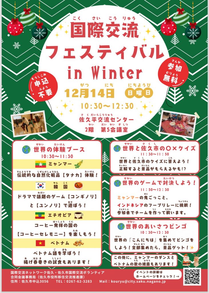 12/14(日)に佐久平交流センターで国際交流フェスティバルがあります。