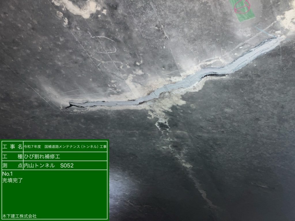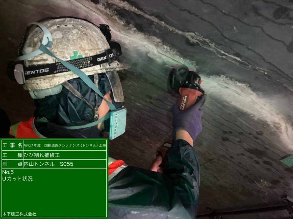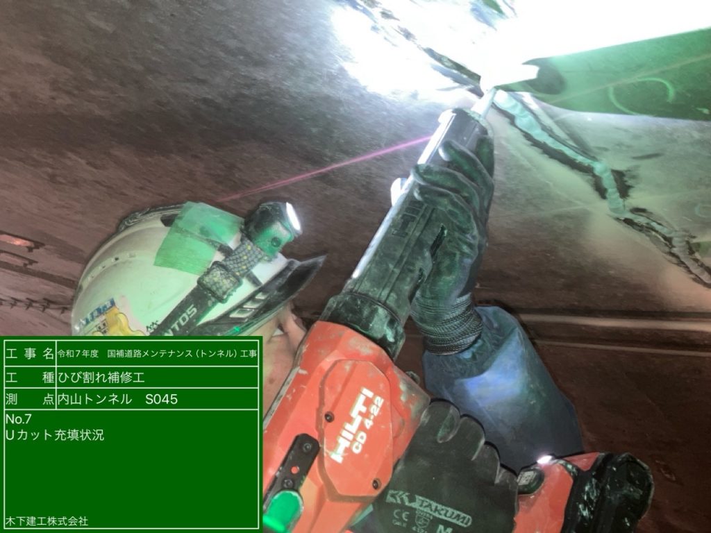内山トンネルの補修工事現場では、現在ひび割れ補修工を行っています。